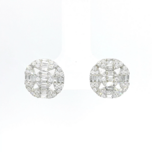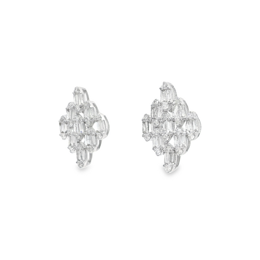 Diamond Shaped Stud Earrings in 18K White Gold set with Baguette and Round Diamonds